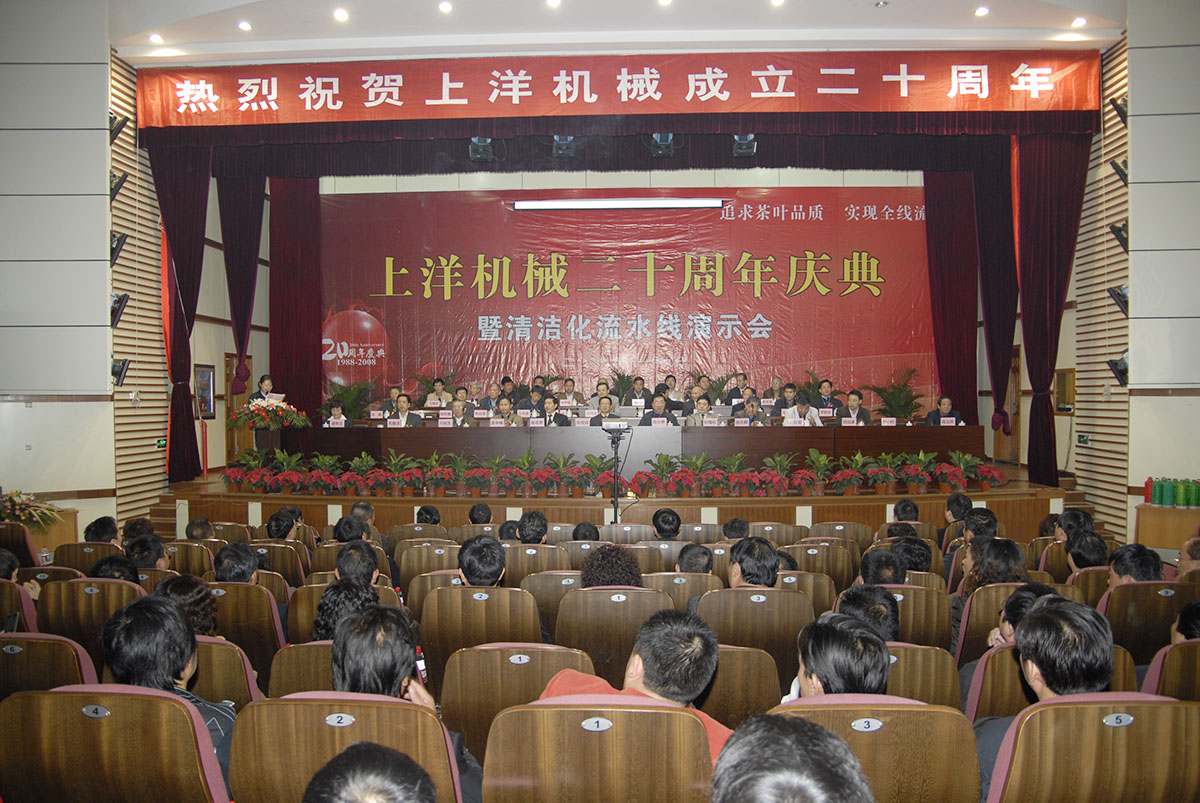 • 2008年,企業(yè)喜遷辦公大樓,上洋二十周年慶典隆重召開,來自社會各界領(lǐng)導(dǎo)及茶界專家、客戶共600余人參會。企業(yè)以“使清潔化更清潔,讓流水線流起來”為理念,引導(dǎo)茶加工產(chǎn)業(yè)發(fā)展新潮流,標(biāo)志著公司在發(fā)展進(jìn)程中邁出新的一步。