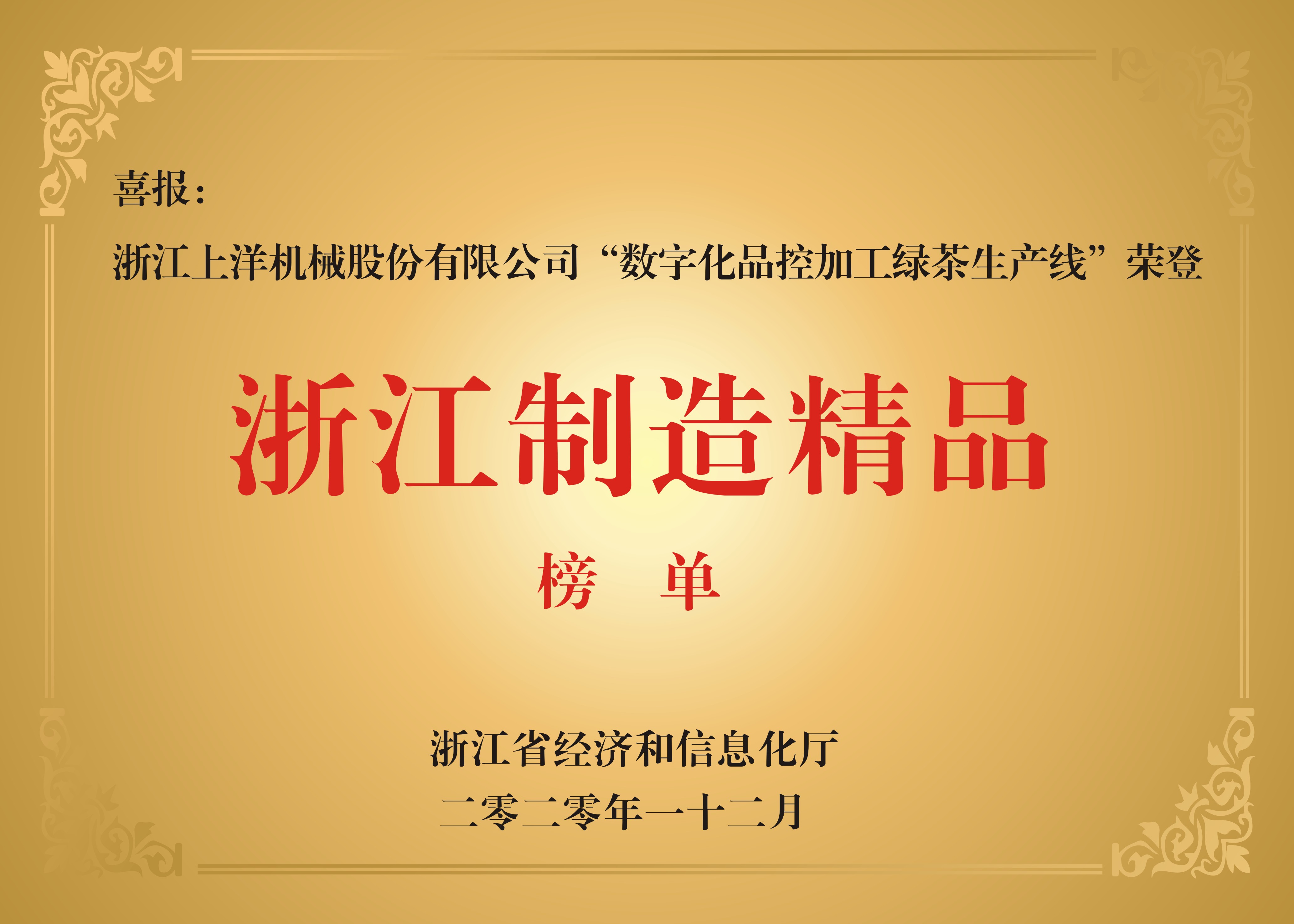 • 2020年, “6CRK-55茶葉揉捻機(jī)”獲“浙江制造品字標(biāo)”認(rèn)證榮譽(yù),“數(shù)字化品控加工綠茶生產(chǎn)線”榮登“浙江制造精品”榜單。