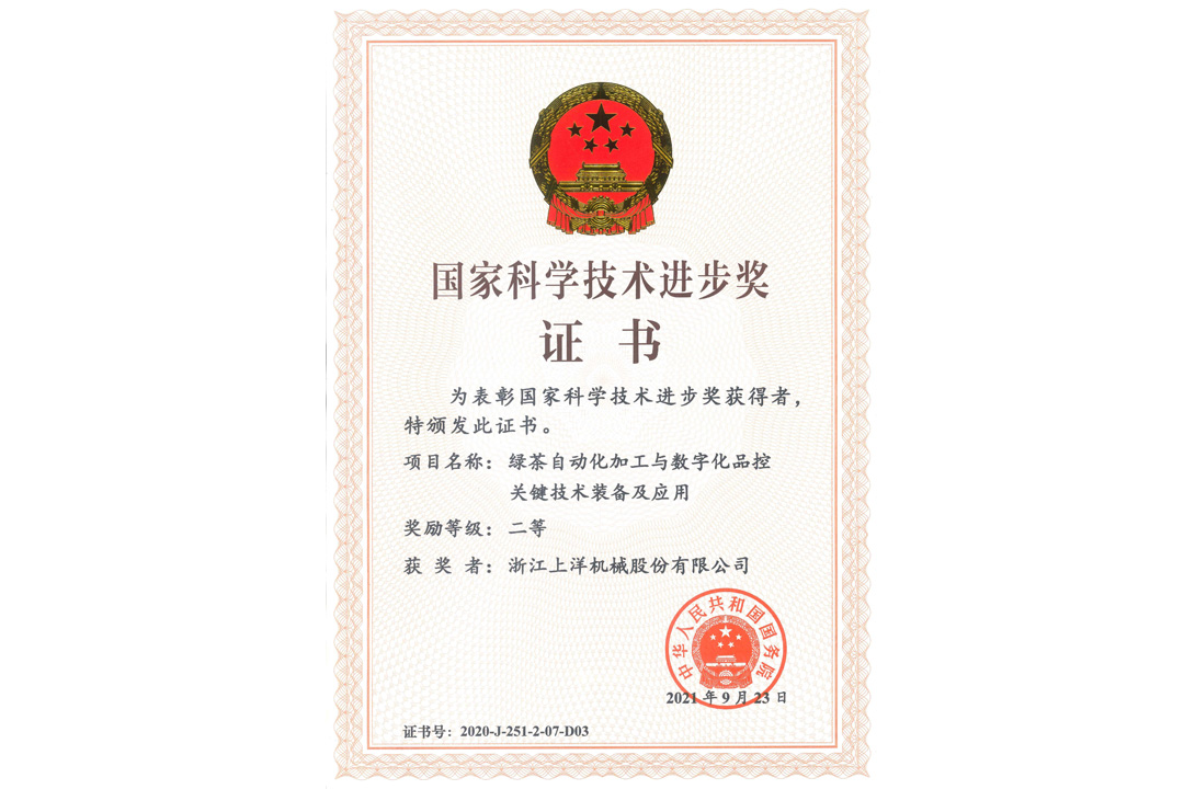 • 2021年11月3日,公司與安徽農(nóng)業(yè)大學(xué)等單位聯(lián)合申報的《綠茶自動化加工與數(shù)字化品控關(guān)鍵技術(shù)裝備及應(yīng)用》獲得國家科學(xué)技術(shù)進(jìn)步獎二等獎。公司按照“品控數(shù)字化-加工自動化-技術(shù)體系化”思路,歷經(jīng)14年攻關(guān)和應(yīng)用,獲獎項(xiàng)目技術(shù)及裝備推廣至我國所有產(chǎn)茶省(市、區(qū))的 1200 多家茶葉企業(yè)。