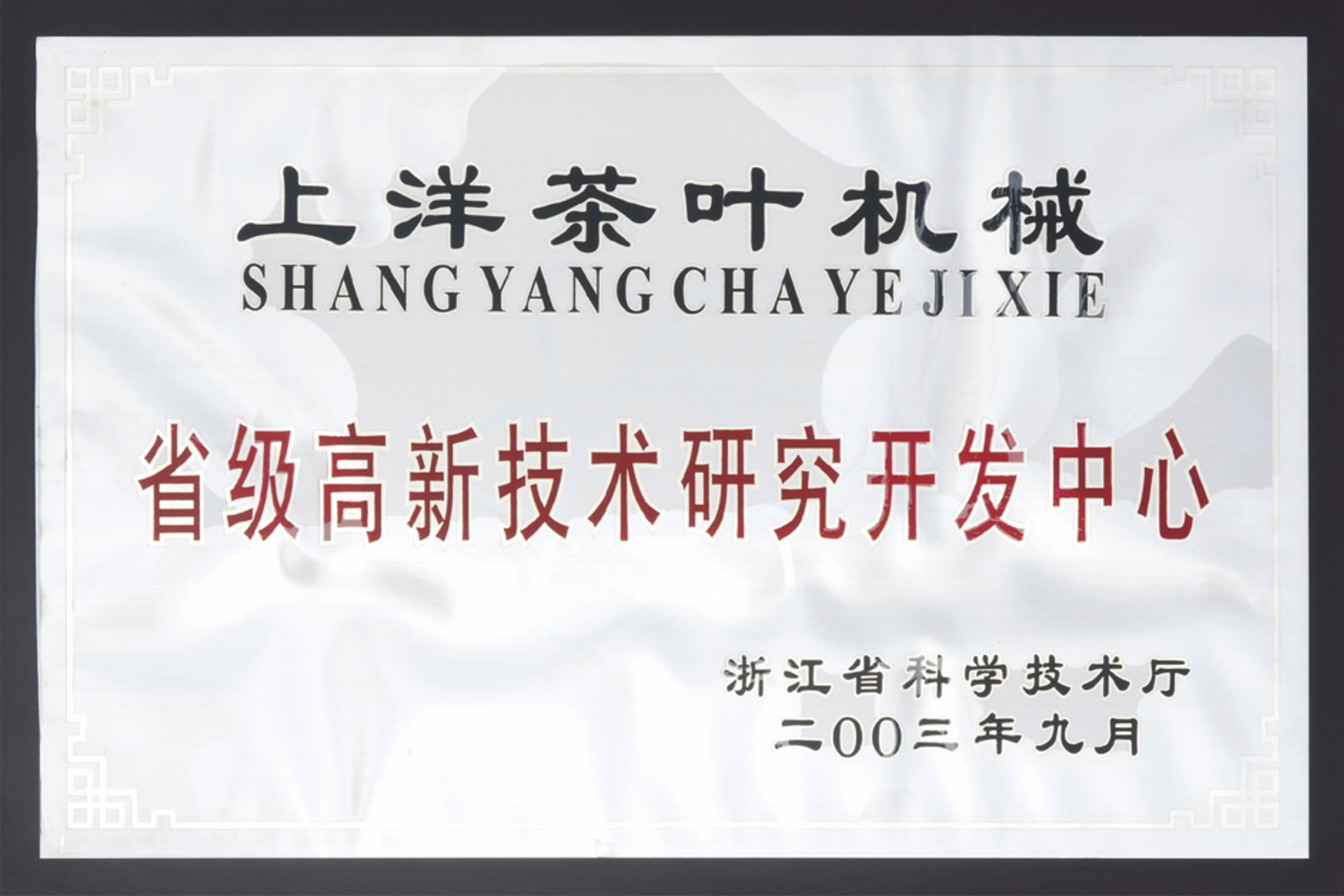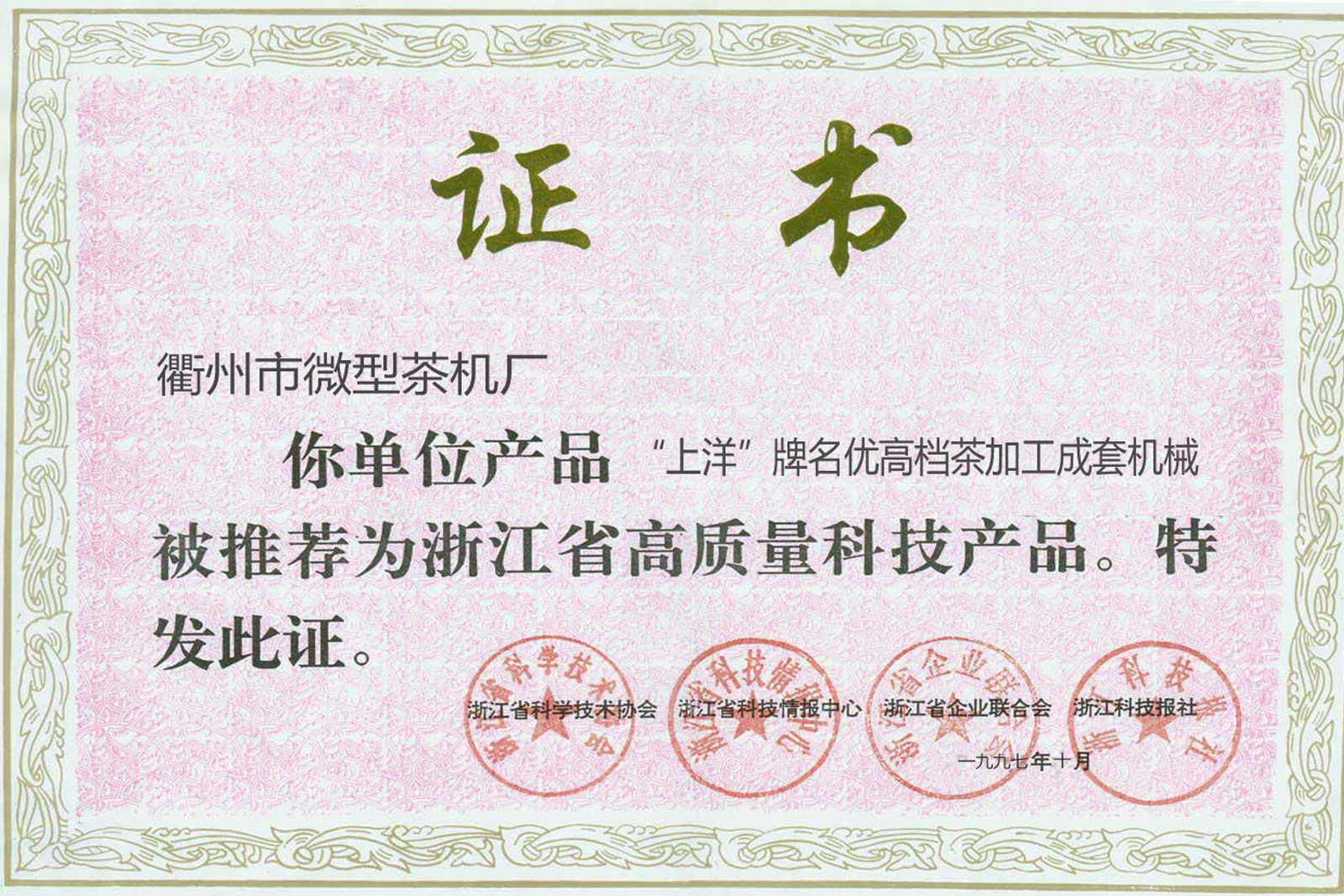 • 1997年10月,“上洋”牌名優(yōu)高檔茶加工成套機(jī)械被評為浙江省高質(zhì)量科技產(chǎn)品。