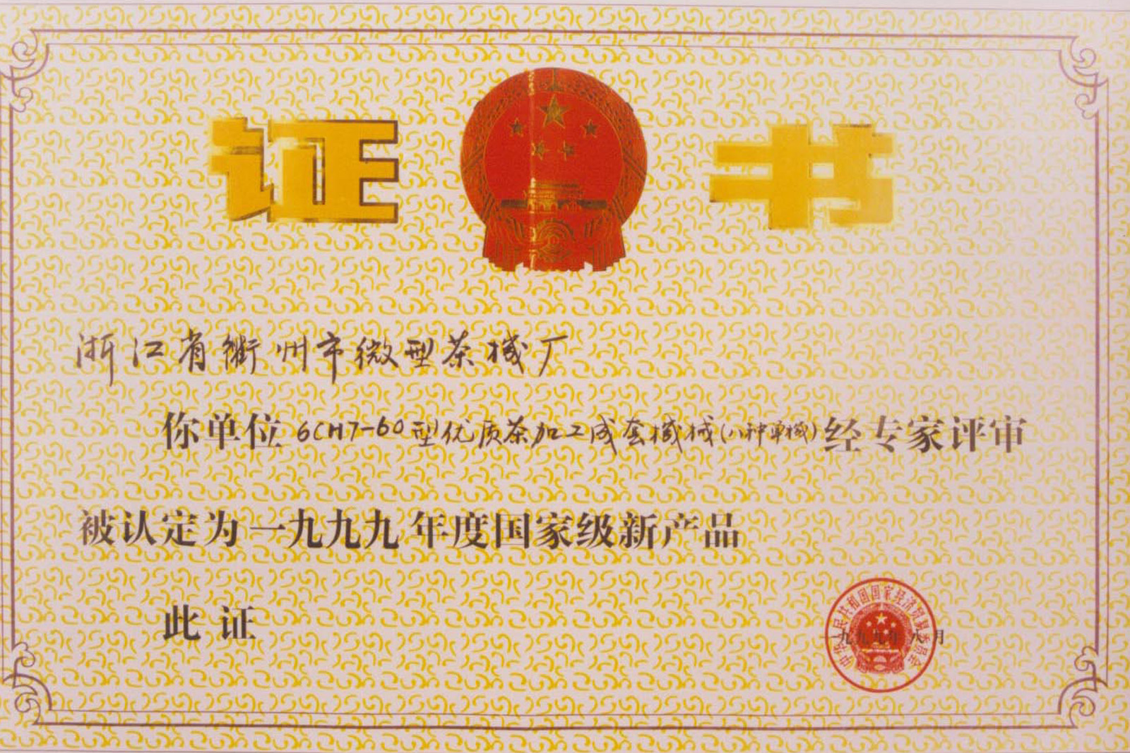 • 1991年,微型成套名優(yōu)茶加工機(jī)械通過省級新產(chǎn)品鑒定,這是國內(nèi)最早通過省級鑒定的茶機(jī)產(chǎn)品,同年該產(chǎn)品分別榮獲浙江省科技進(jìn)步三等獎。
