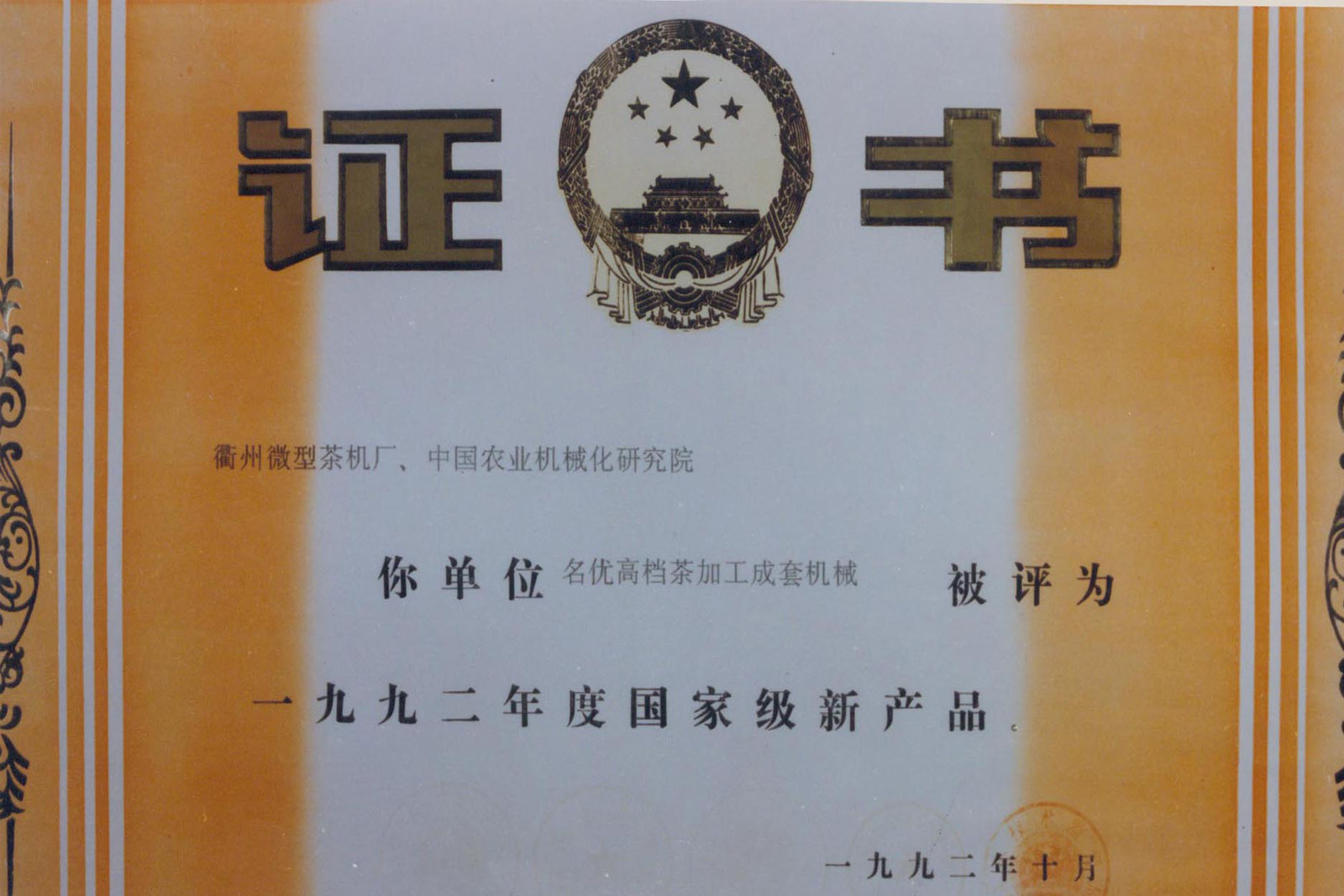 • 1992年10月,公司自主開發(fā)的“名優(yōu)高檔茶加工成套機(jī)械”通過國家級新產(chǎn)品鑒定,促進(jìn)與推動了我國茶葉加工向機(jī)械化、效率化、商品化方向發(fā)展。